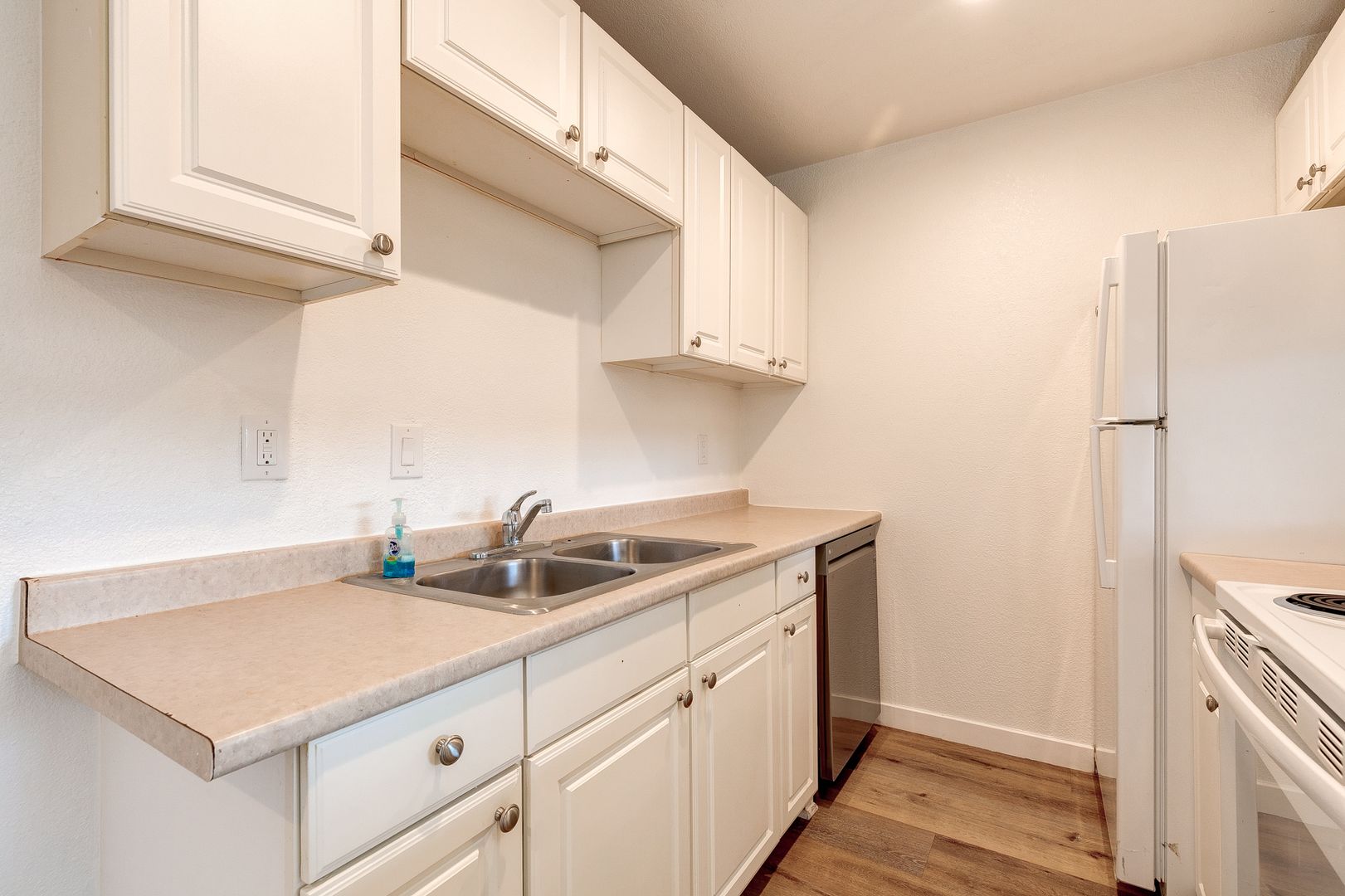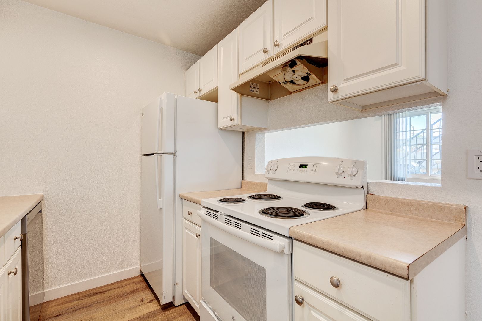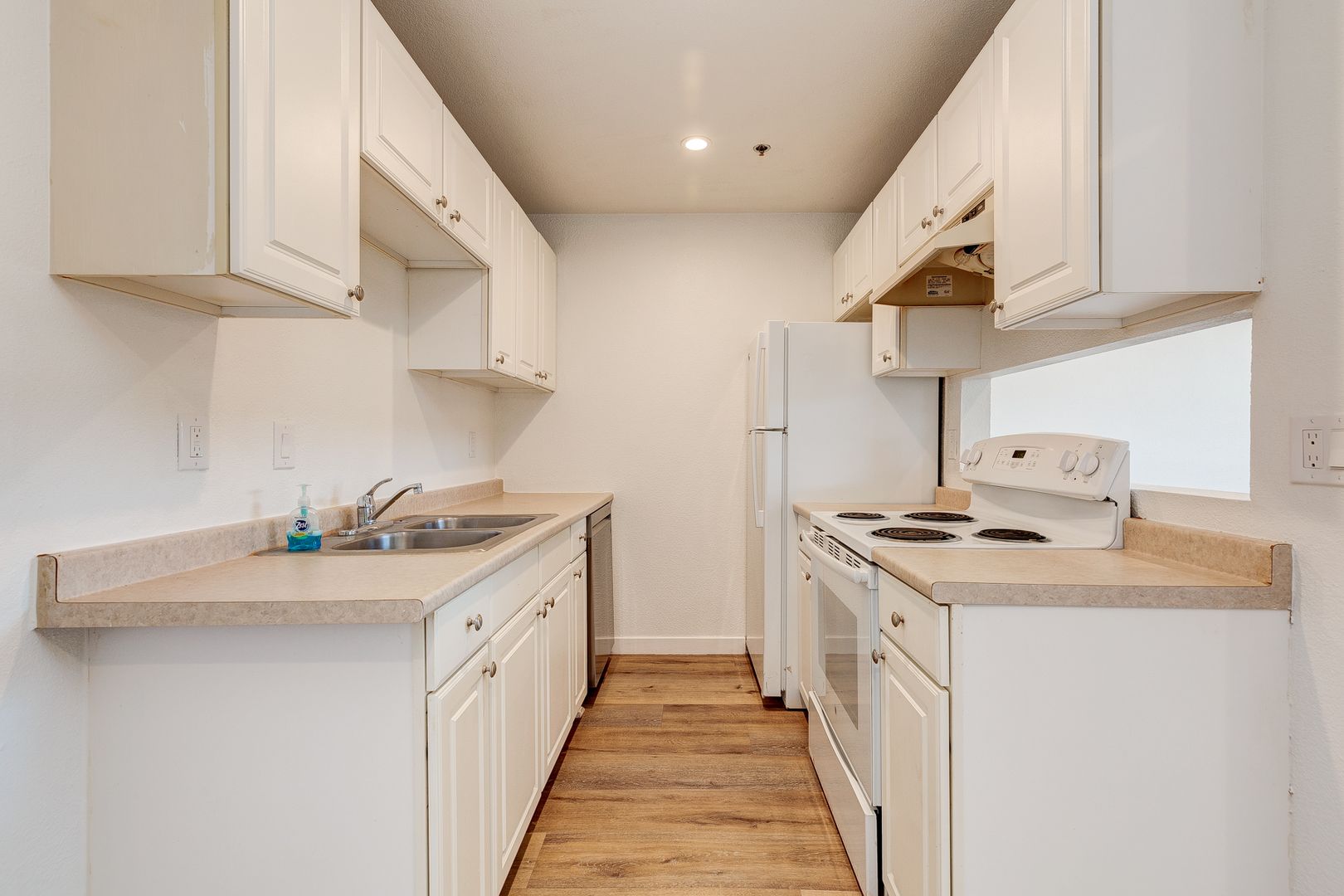 Galley kitchen open to living room. Refrigerator, Dishwasher, and stove.