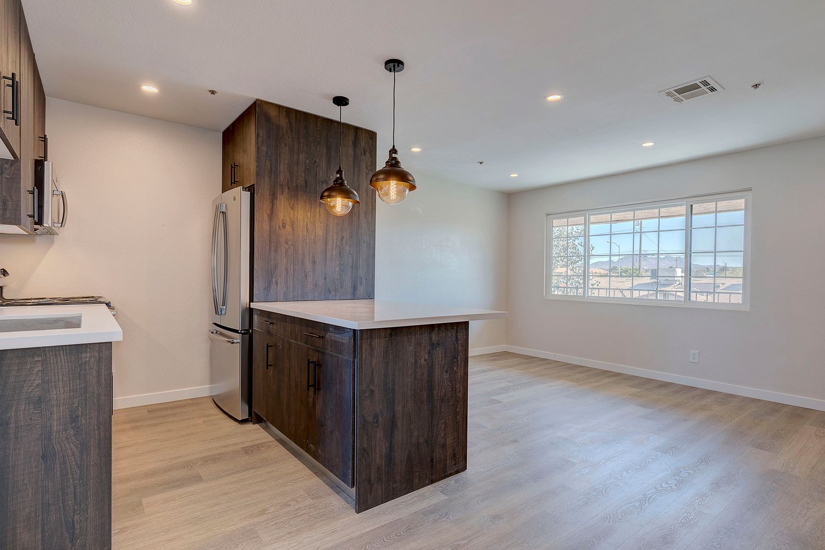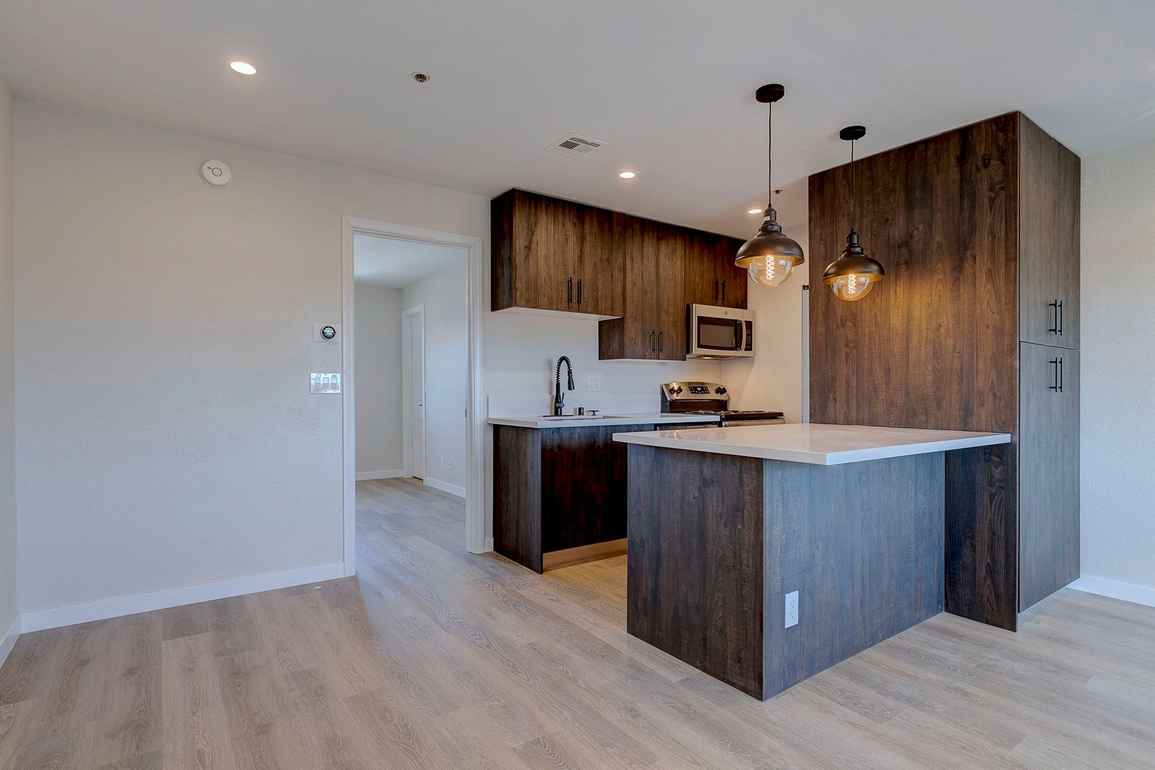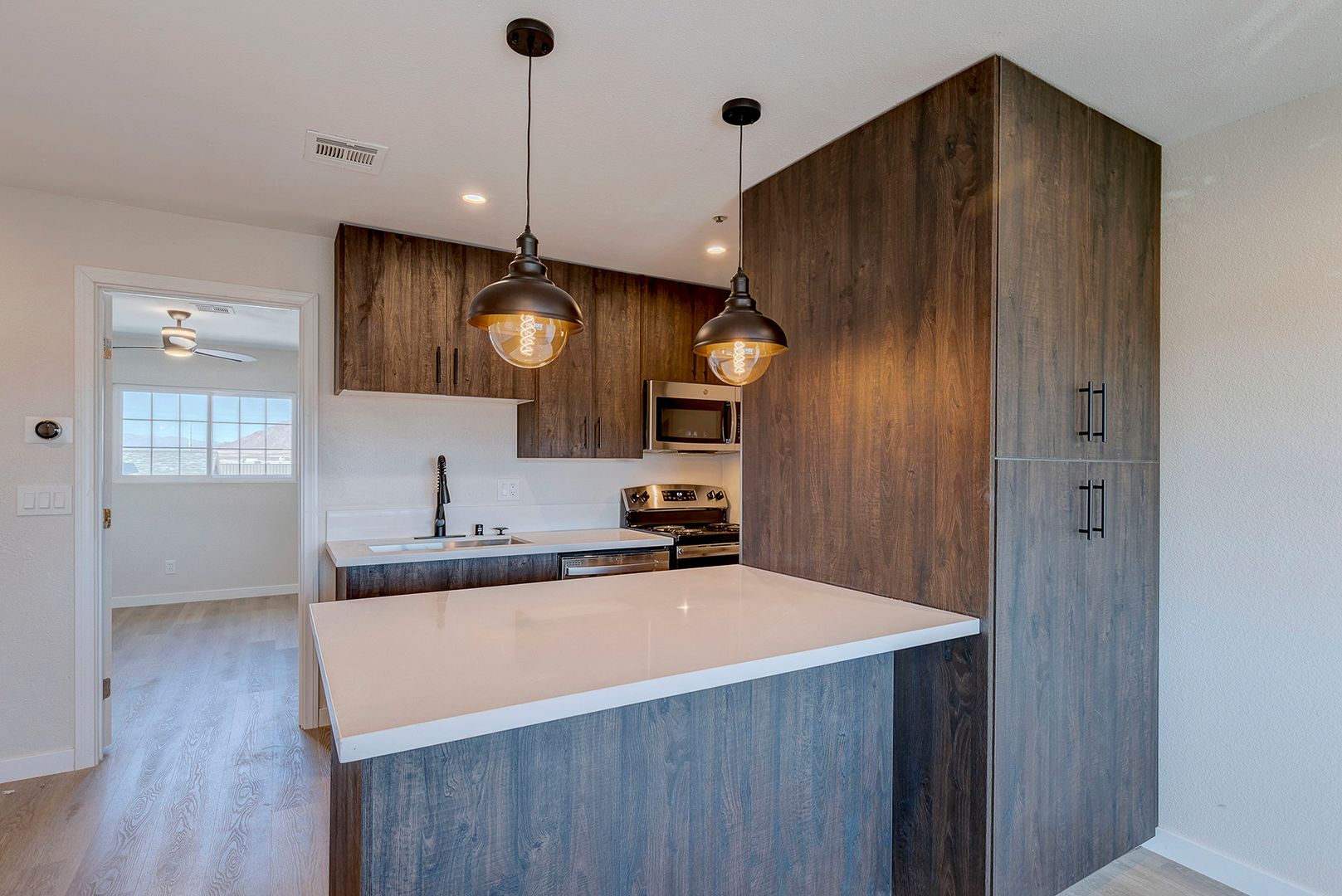 Galley kitchen open to living room with Corian counters, modern kitchen cabinets, breakfast bar, and stainless steel appliances.