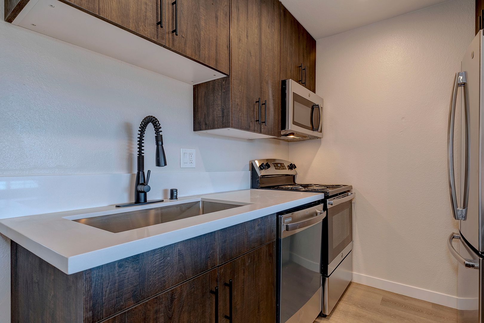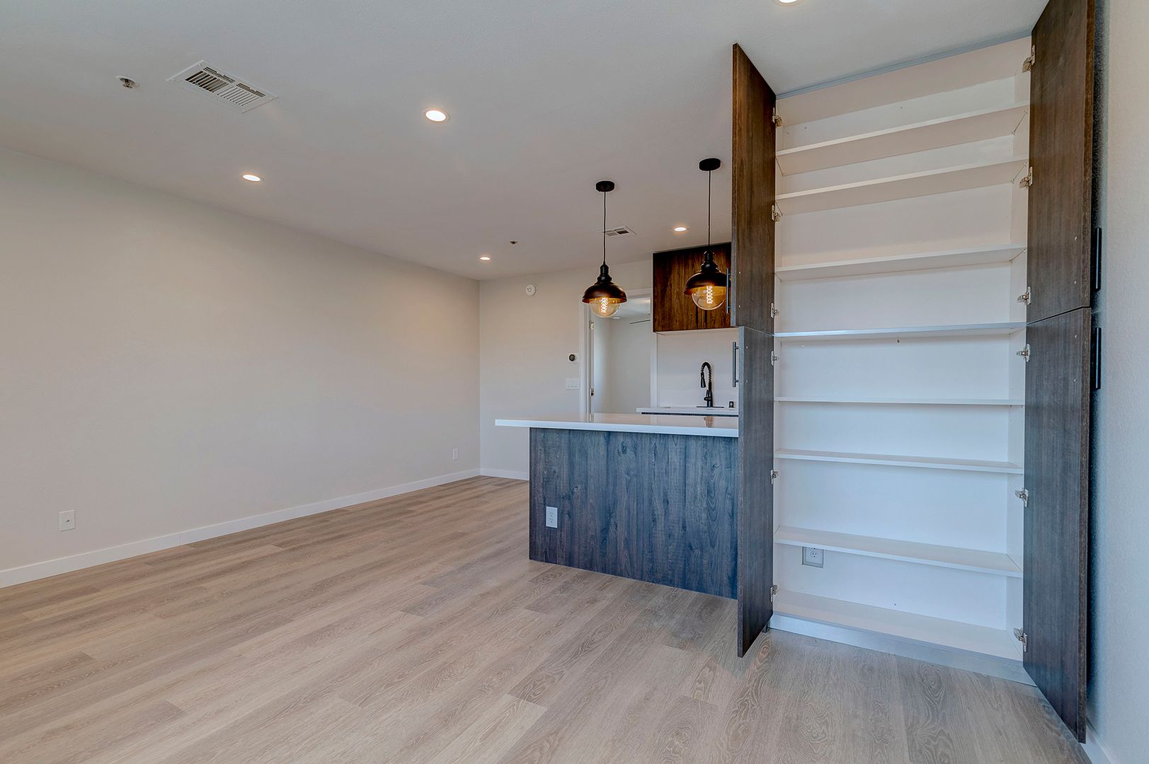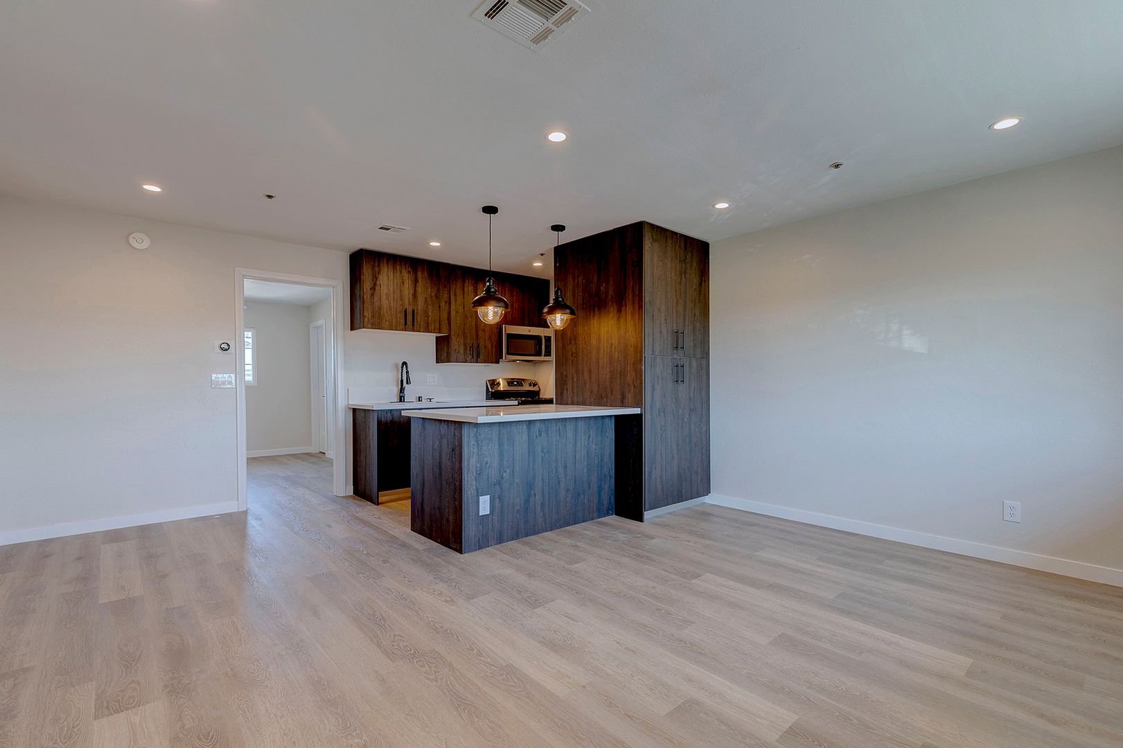 Galley kitchen open to living room with Corian counters, modern kitchen cabinets, breakfast bar, and stainless steel appliances.