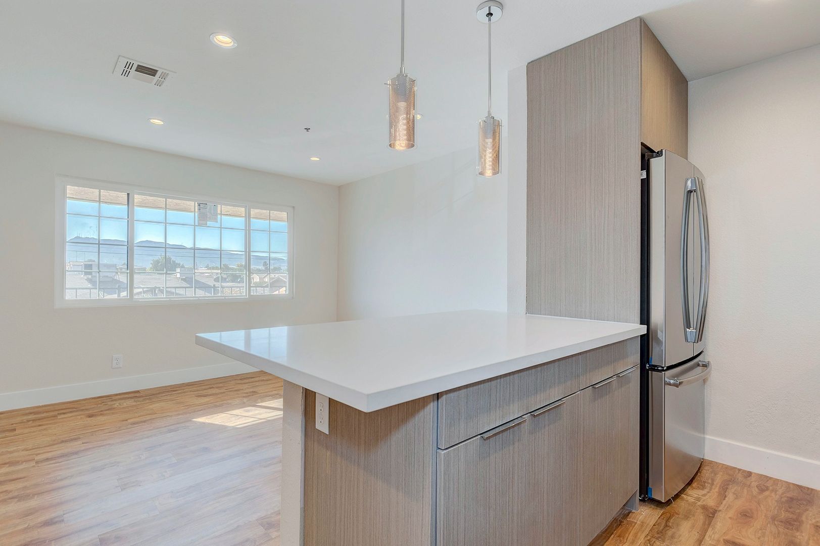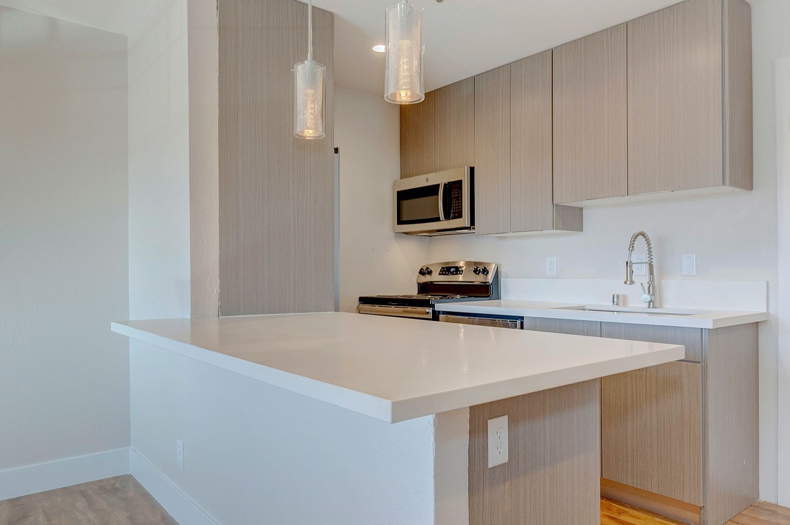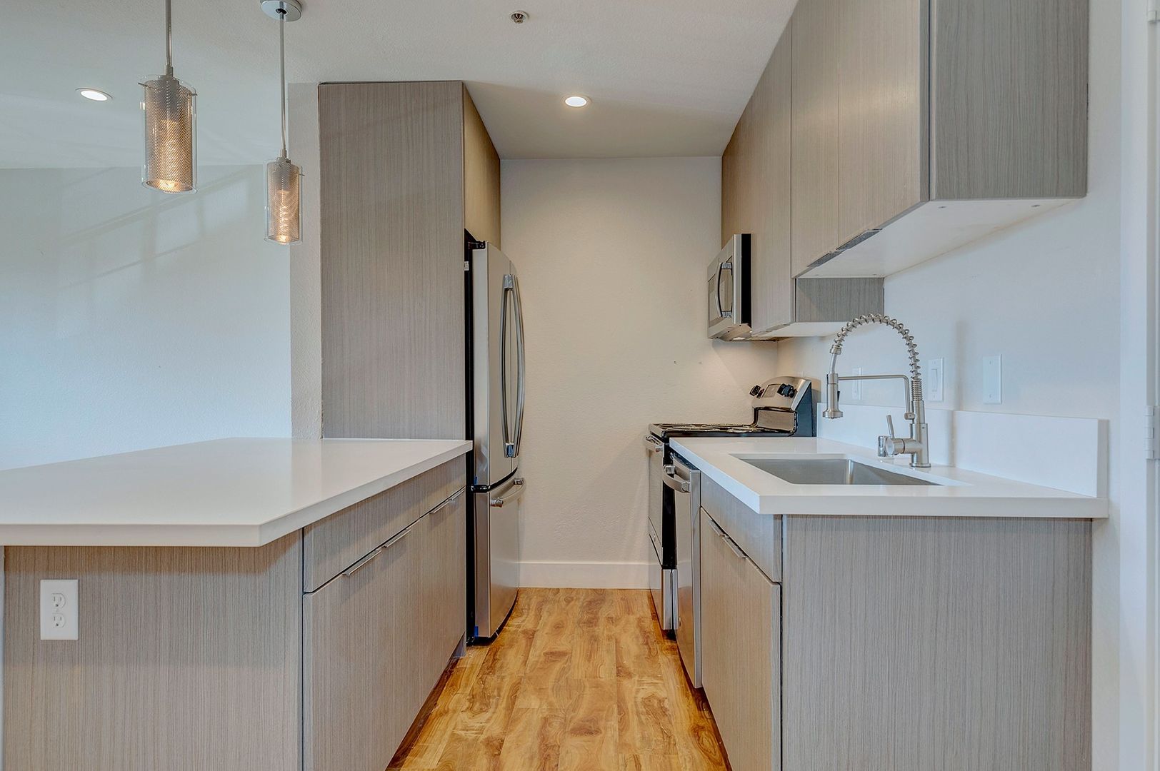 Galley kitchen open to living room with Corian type quartzite counters, modern kitchen cabinets, breakfast bar, and stainless steel appliances.