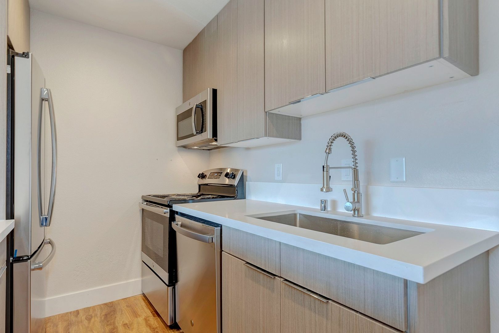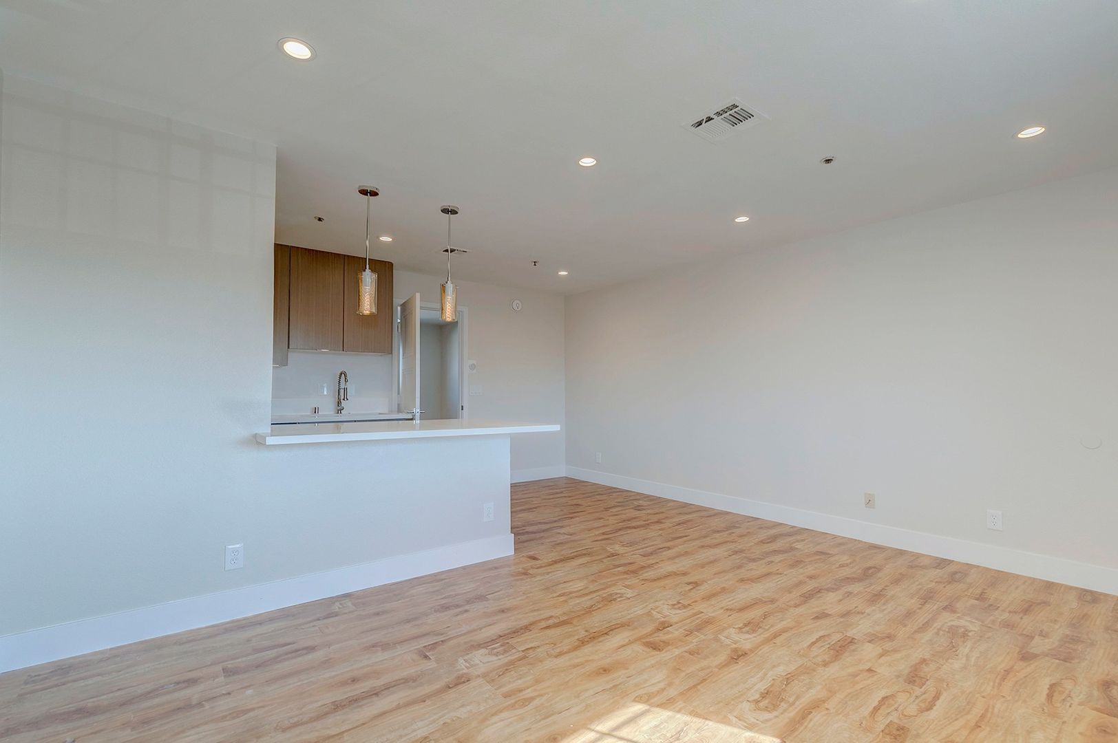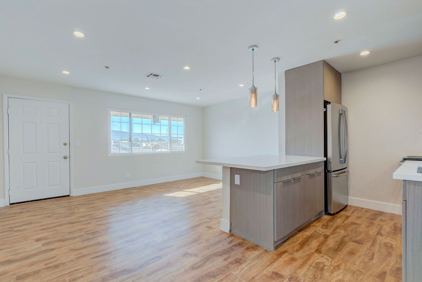 Galley kitchen open to living room with Corian type quartzite counters, modern kitchen cabinets, breakfast bar, and stainless steel appliances.