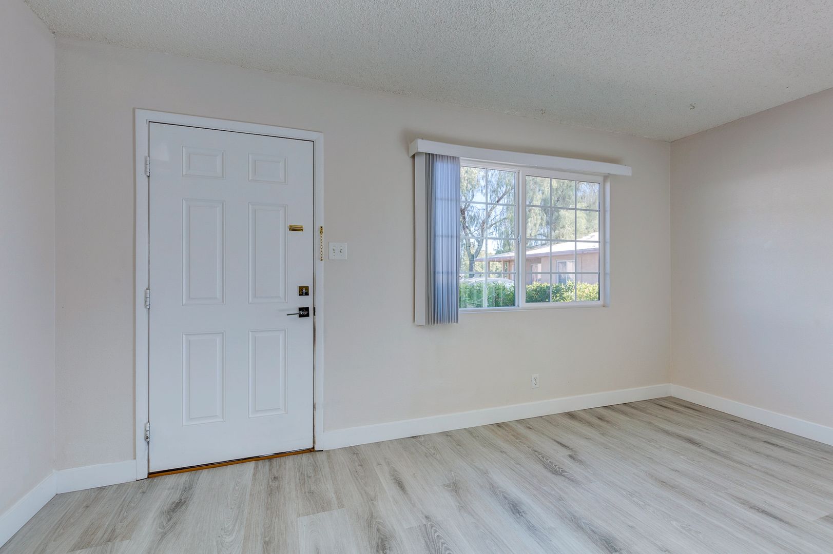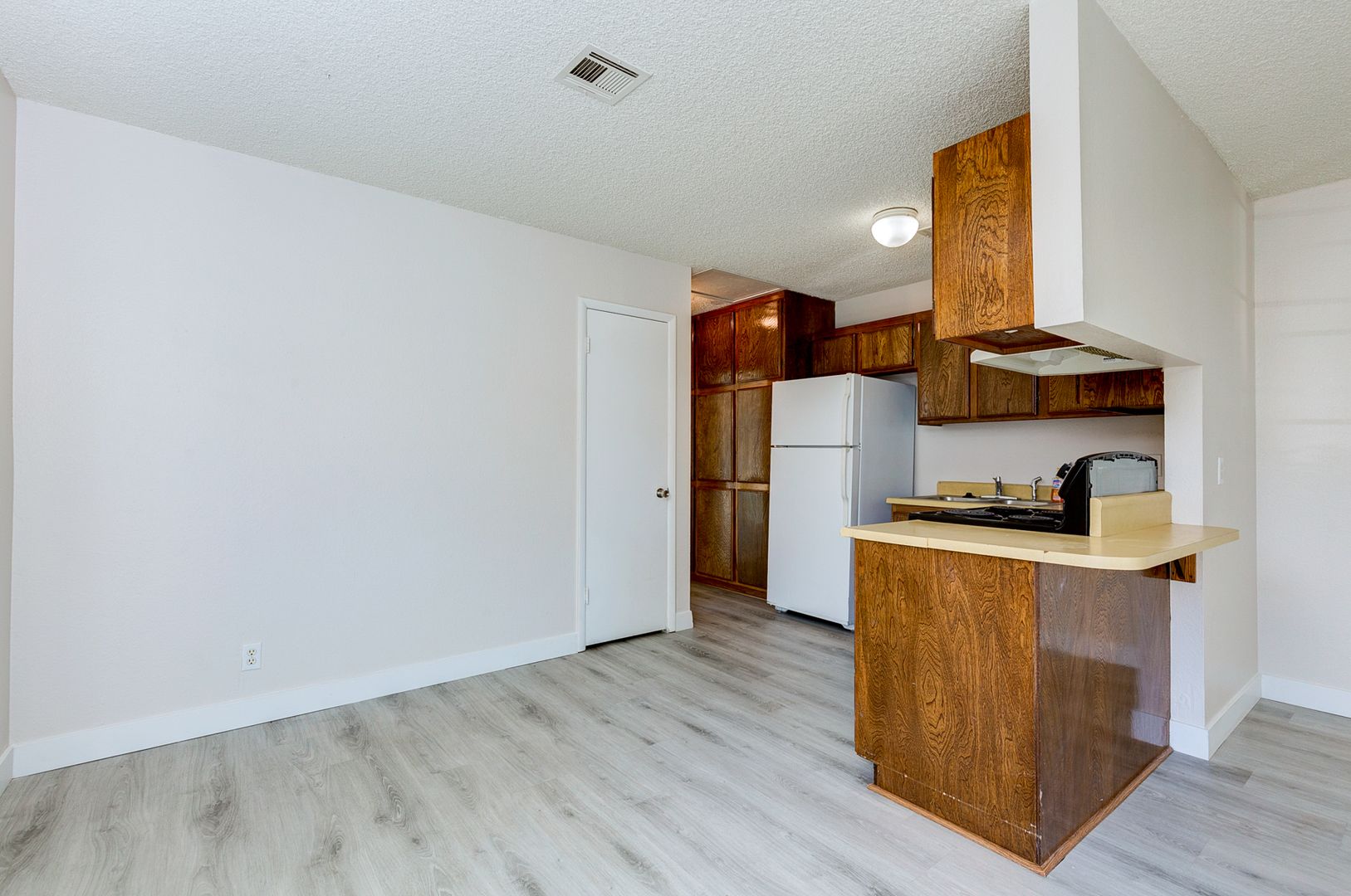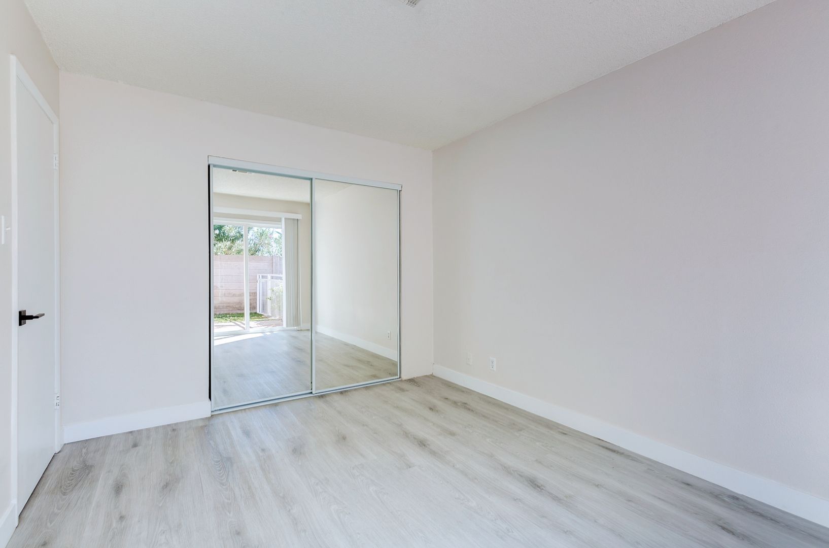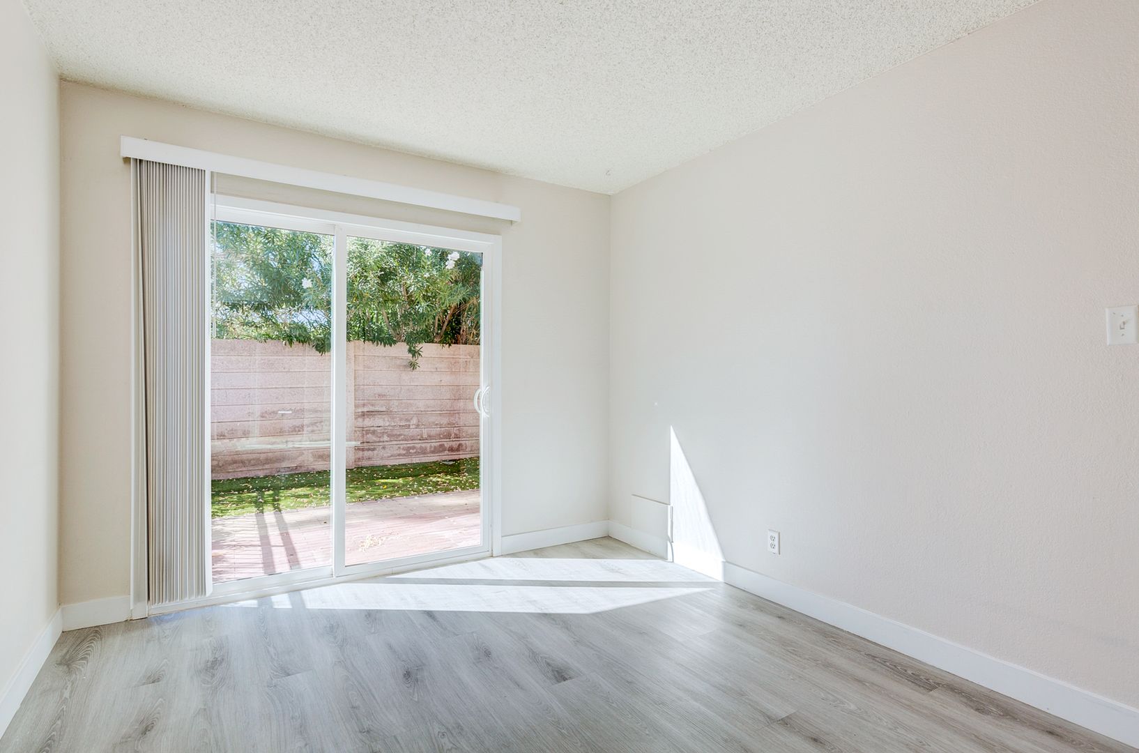 Large One Bedroom apartment, approximately 650 sq ft, with large open living room and bedroom with sliding doors to private backyard.