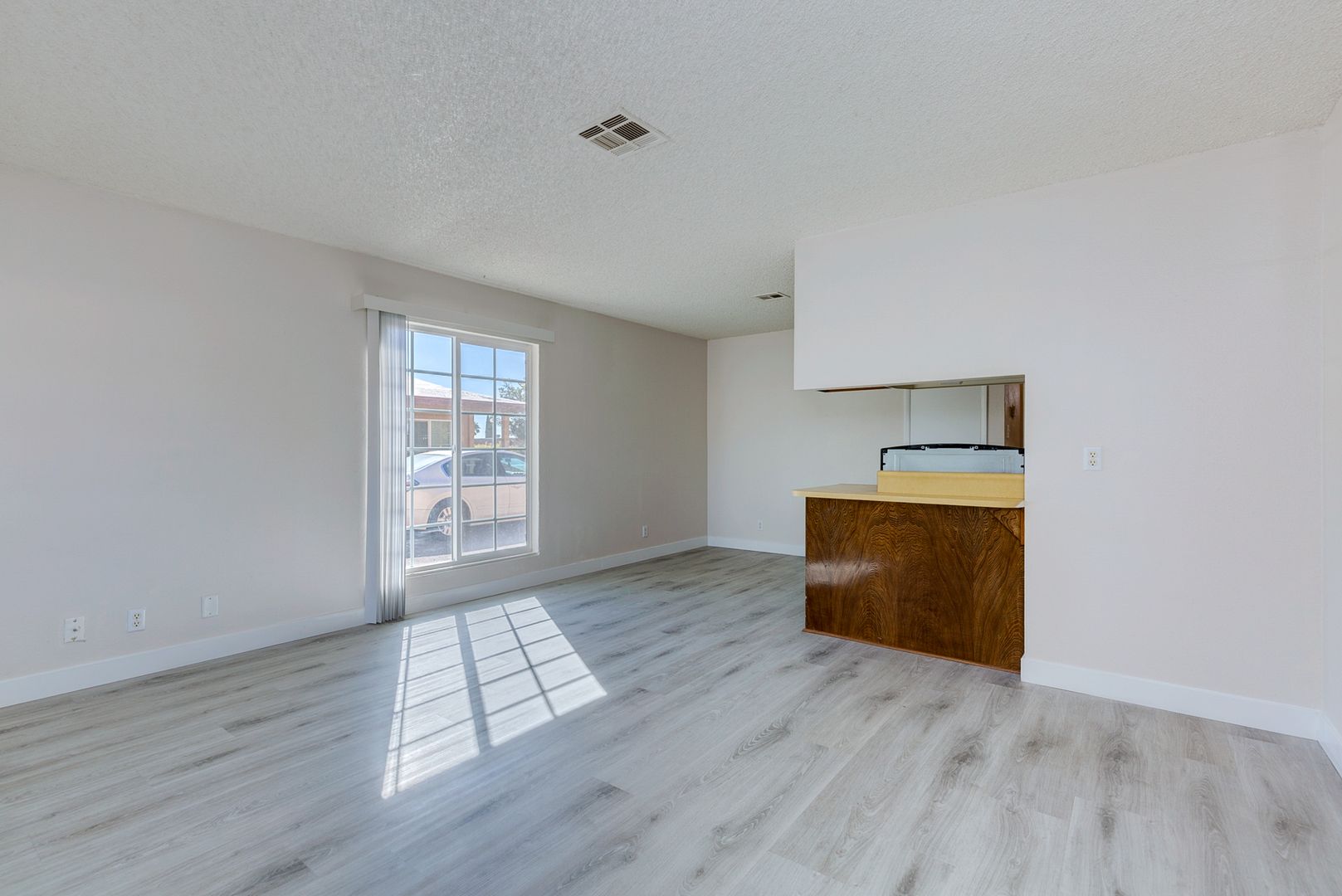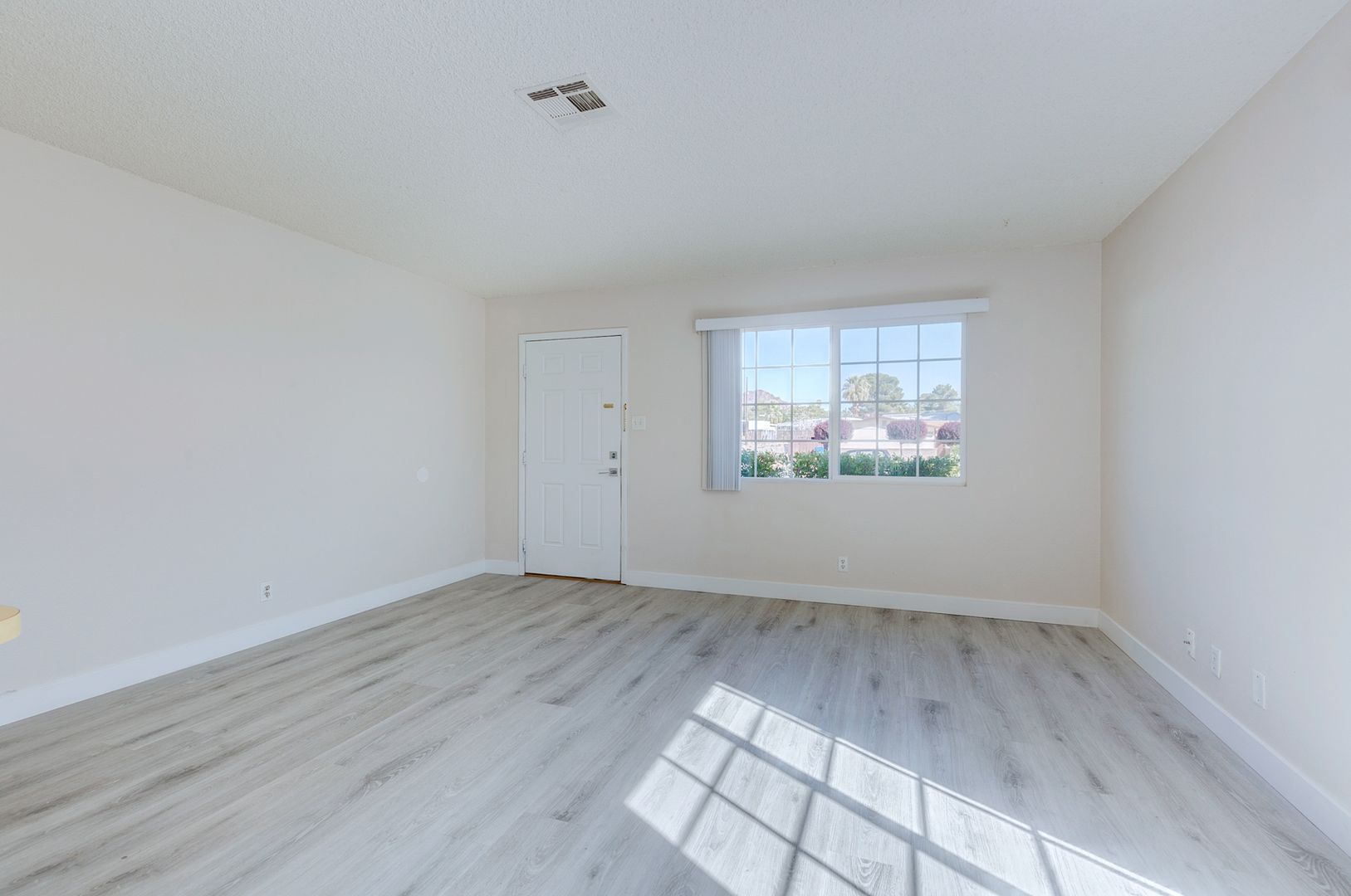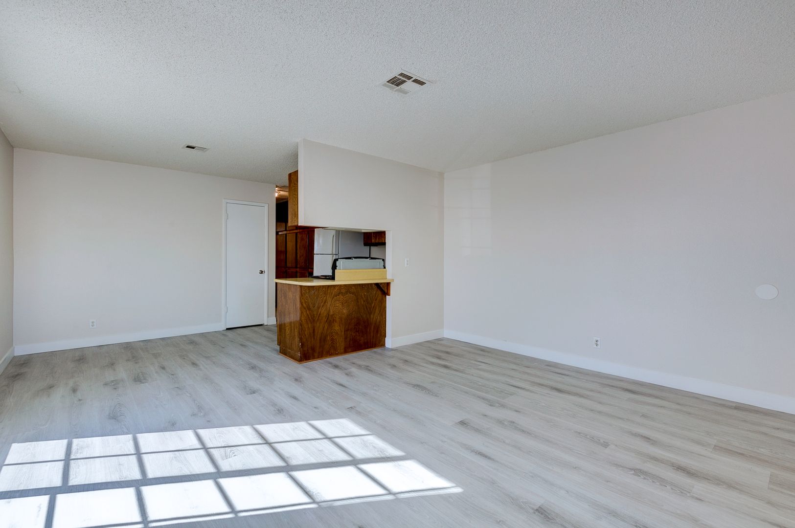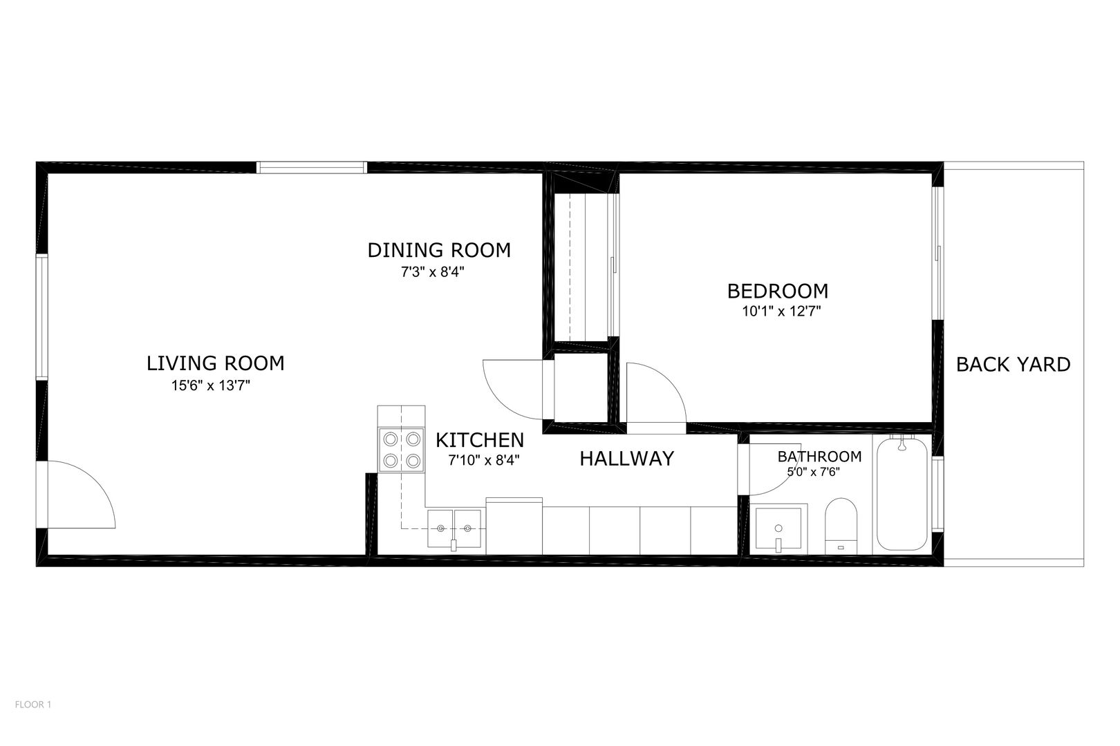Large One Bedroom apartment, approximately 650 sq ft, with large open living room and bedroom with sliding doors to private backyard.
